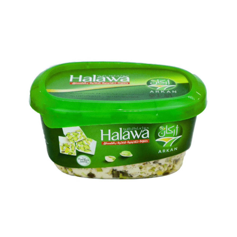 Arkan Halawa with Pistachios is a premium Middle Eastern sweet delicacy made from rich tahini (sesame paste), sugar, and crunchy pistachio pieces. It offers a perfect balance of nutty flavor and sweetness, enhanced by the distinctive taste of roasted pistachios. Enjoyed as a dessert, snack, or spread, this halawa delivers authentic taste, creamy texture, and natural nutrition in every bite.