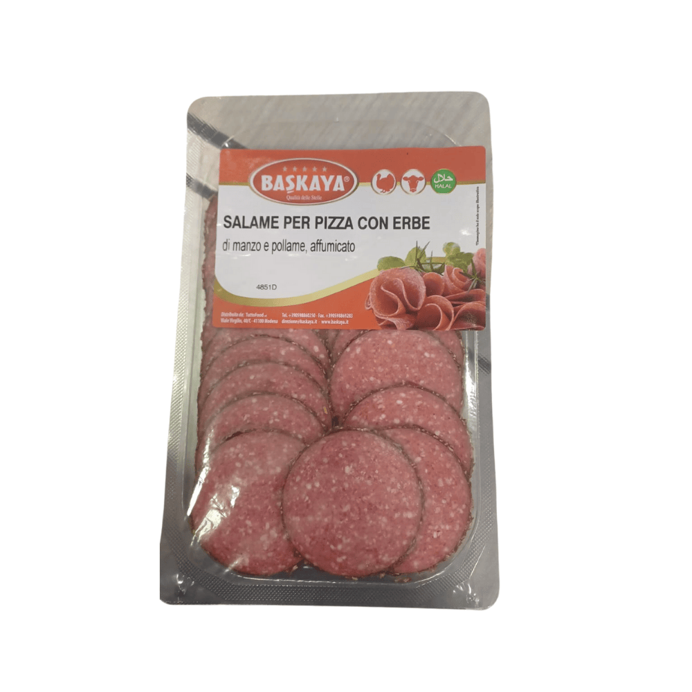 Baskaya Salami For Pizza With Smoked Beef and Poultry is made from premium quality smoked beef and poultry, carefully seasoned for a rich, savory flavor. Perfect for topping pizzas, sandwiches, or wraps, this ready-to-use salami delivers consistent taste and texture. Conveniently packed, it is ideal for both home kitchens and professional use.