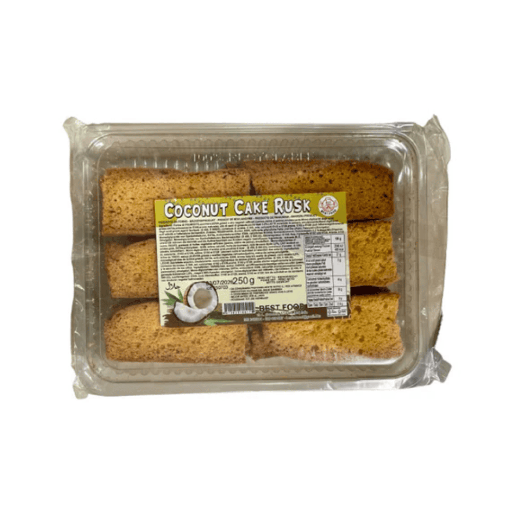 Coconut Cake Rusk is a golden, twice-baked delicacy with a rich coconut flavor and crisp texture. Perfectly crunchy and lightly sweet, it’s the ideal companion for tea, coffee, or a quick snack.