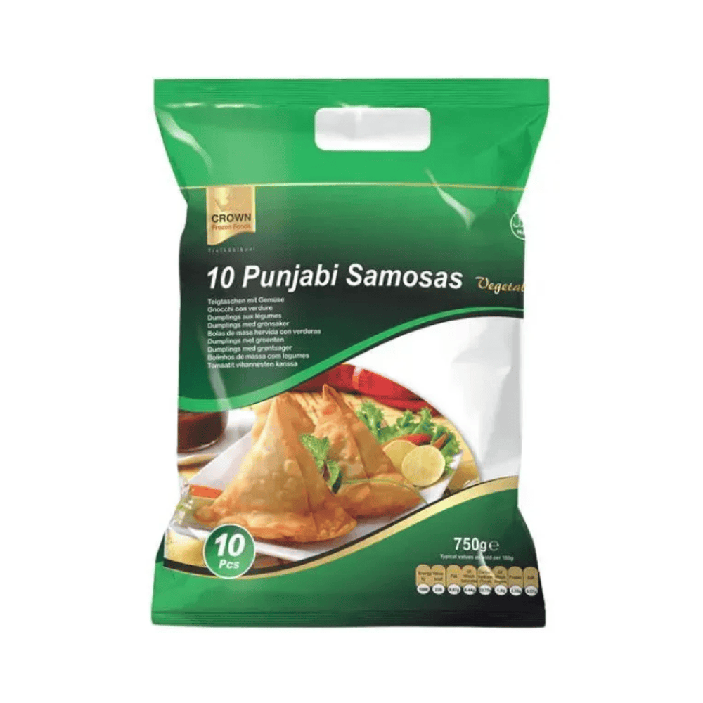 Crown Foods Vegetable Punjabi Samosas are large, crispy pastries filled with a delicious blend of spiced potatoes, peas, and aromatic herbs. Inspired by traditional Punjabi flavors, these samosas are perfect for tea-time snacks, parties, or appetizers.