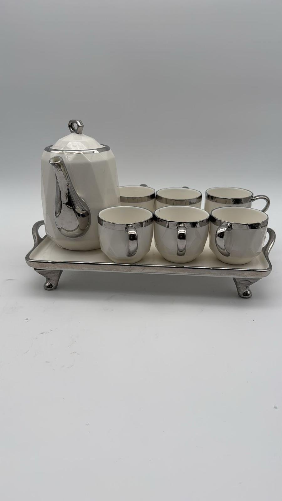 Elegante Set da Tè Bianco e Argento – Set in Ceramica da 7 Pezzi con Vassoio
