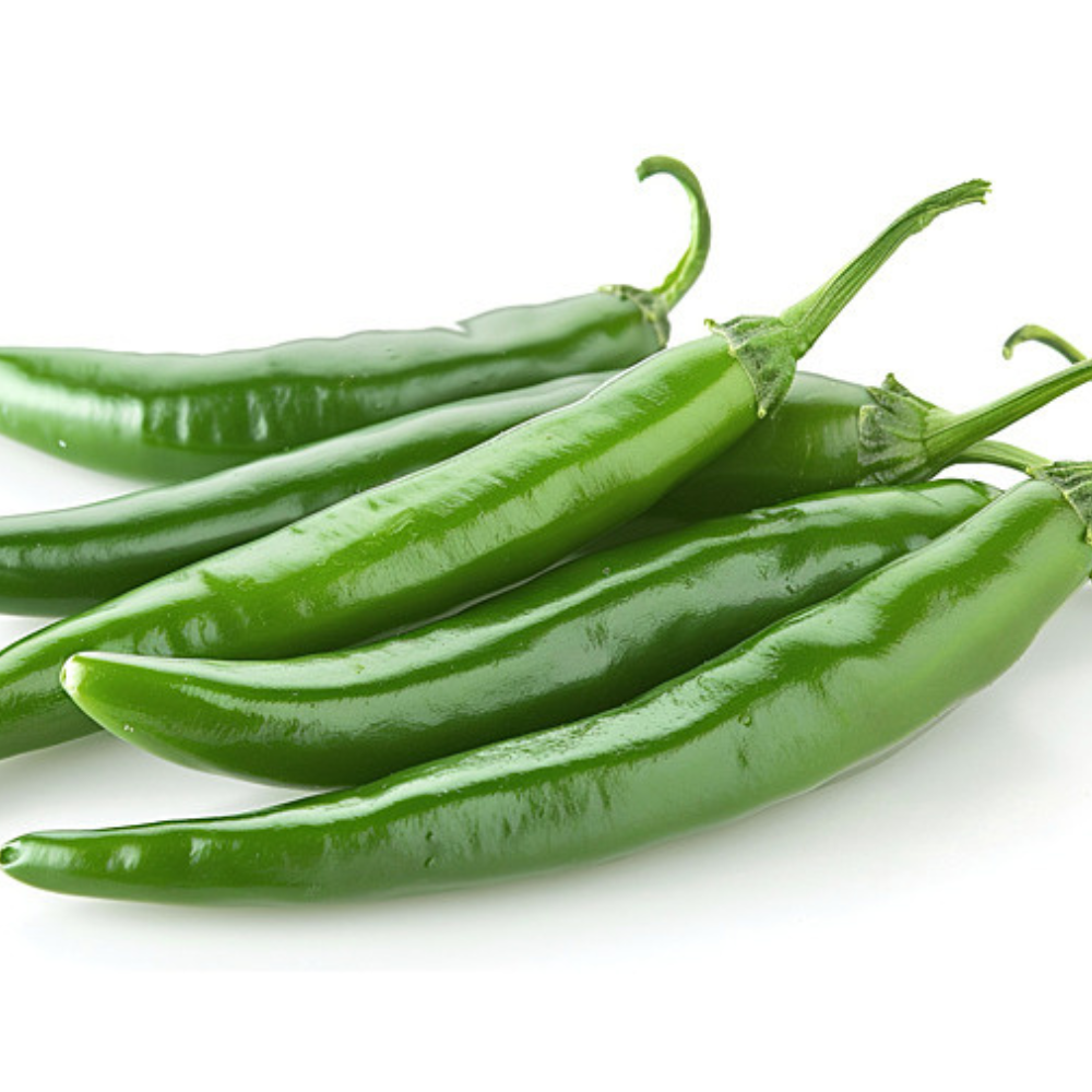 Fresh and vibrant green chilies packed with natural heat and flavor. Perfect for adding spice and aroma to curries, sauces, and marinades.
