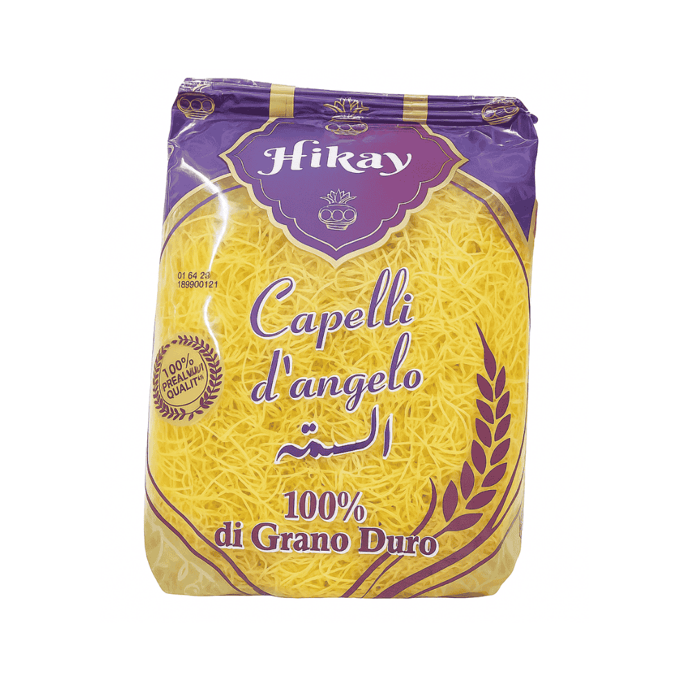 Hikaya Capelli d’Angelo Pasta Vermicelli is a premium-quality, thin Italian-style pasta made from 100% durum wheat semolina. Known as “angel hair,” this delicate pasta cooks quickly and has a light, tender texture that pairs perfectly with a variety of sauces, soups, and stir-fried dishes. Its fine strands make it ideal for elegant, quick-cooking meals.