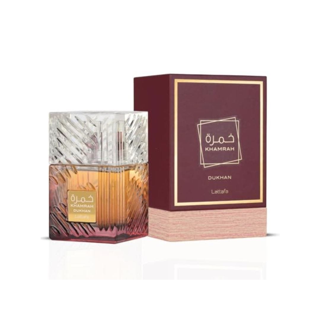 Khamrah Dukhān è la versione più intensa e fumosa della trilogia Khamrah di Lattafa. Questo Eau de Parfum si apre con note speziate e resinose, seguite da un cuore di incenso, cuoio e frutta secca. Il fondo rivela un mix ricco di oud, ambra e legni affumicati, creando una scia profonda e affascinante. Il nome “Dukhān” significa “fumo” in arabo, e la fragranza mantiene la promessa con un’aura misteriosa e calda che richiama i rituali tradizionali mediorientali. Confezionato in un astuccio color amaranto e rame con dettagli dorati e calligrafia araba, Khamrah Dukhān è perfetto per la sera, i mesi invernali e per chi vuole distinguersi.