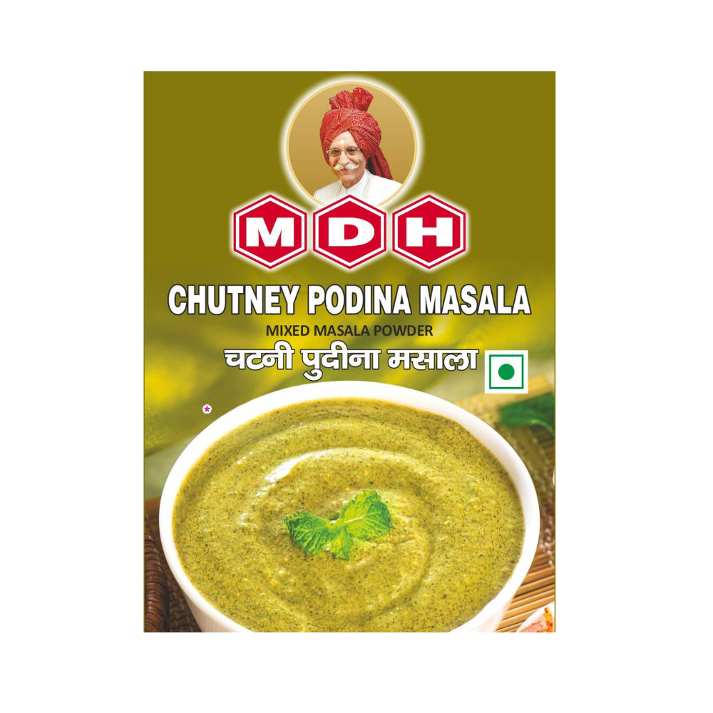 MDH Chutney Podina Masala brings a refreshing minty twist to your snacks and meals. Made with a tangy blend of dried mint leaves, spices, and herbs, it instantly adds the cool, spicy-sour flavor of traditional Indian podina chutney to any dish.