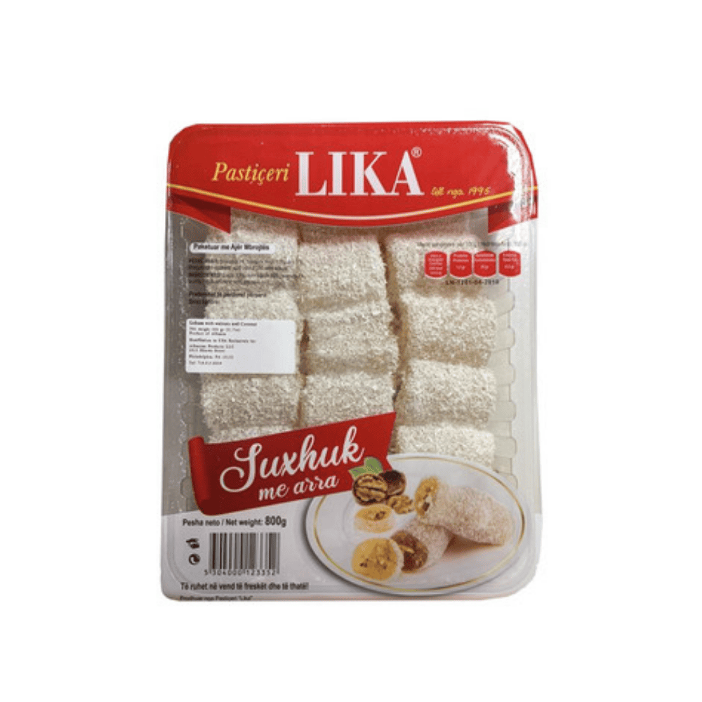 Pastiçeri Lika Suxhuk with Walnuts 800g is a traditional Albanian and Balkan sweet made from natural grape must, thickened and filled with crunchy walnut pieces. This delicious treat, often known as “Turkish churchkhela,” offers a chewy texture with a perfect balance of sweetness and nutty flavor. Ideal for serving with tea or coffee, enjoying as a snack, or gifting during festive occasions, it brings the authentic taste of Mediterranean confectionery to your home.