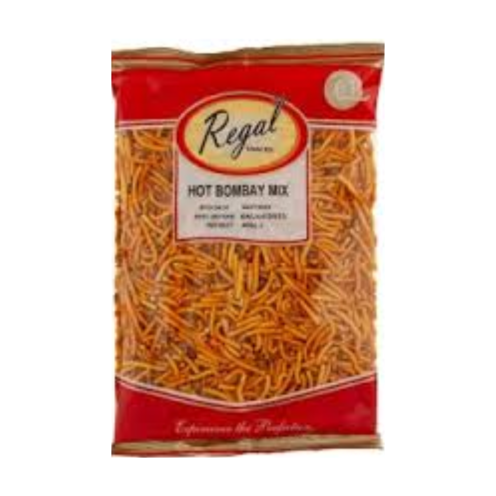 Enjoy the fiery crunch of Regal Hot Bombay Mix Daal — a spicy blend of crispy lentils, chickpea noodles, peanuts, and traditional Indian spices for the ultimate snack-time kick.