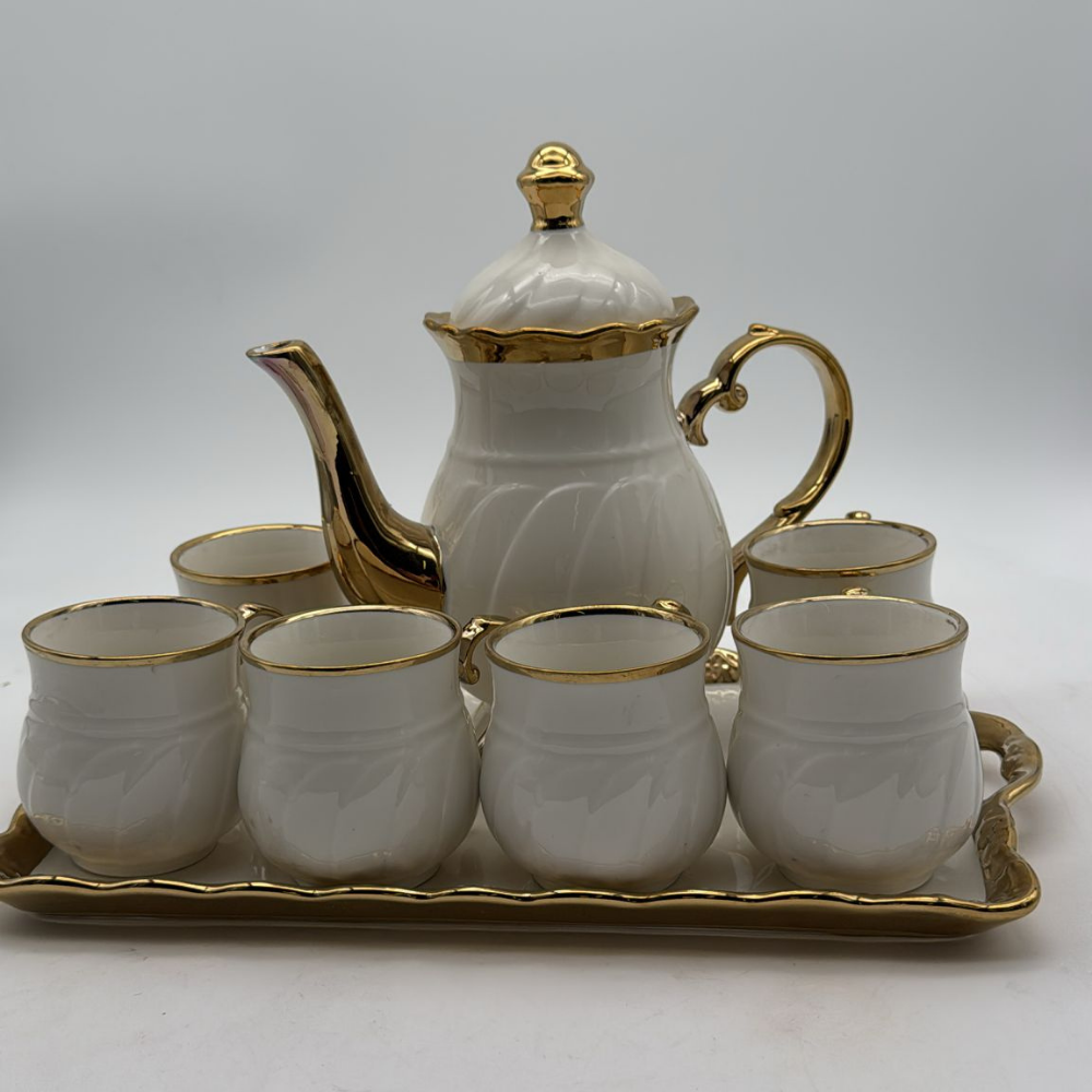 Set Da Tè In Porcellana Bianco E Oro – Teiera Con 6 Tazze E Vassoio Elegante