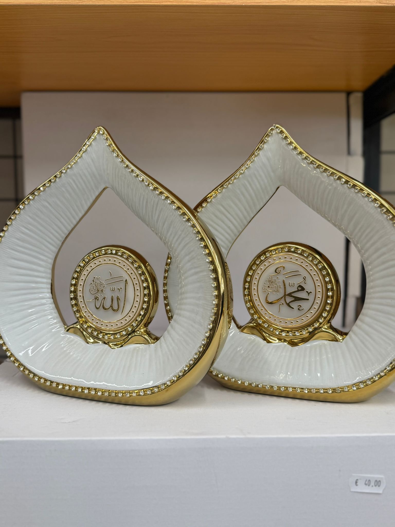 Splendido set decorativo in ceramica con calligrafia “Allah” e “Muhammad” in un design a goccia bianco e dorato. Perfetto per regali islamici o decorazioni.