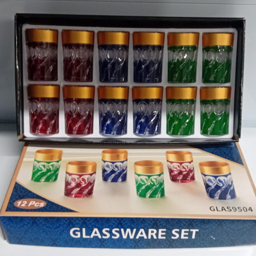 Illumina la tua tavola con questo elegante set da 12 bicchieri, con bordo dorato e colori vivaci. Include bicchieri rossi, blu, verdi e trasparenti con motivi decorativi—perfetti per il tè o come regalo.