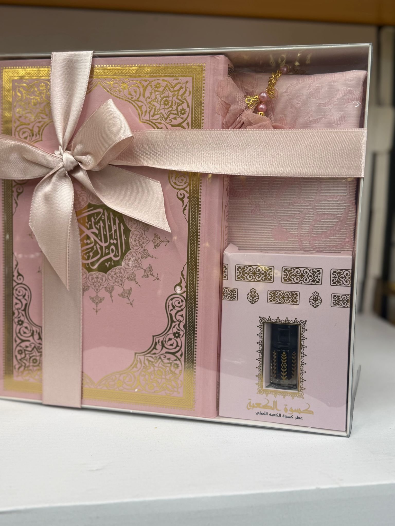 Elegante set islamico rosa con Corano decorato, tappetino da preghiera, tasbih con perle e profumo. Perfetto per occasioni speciali.