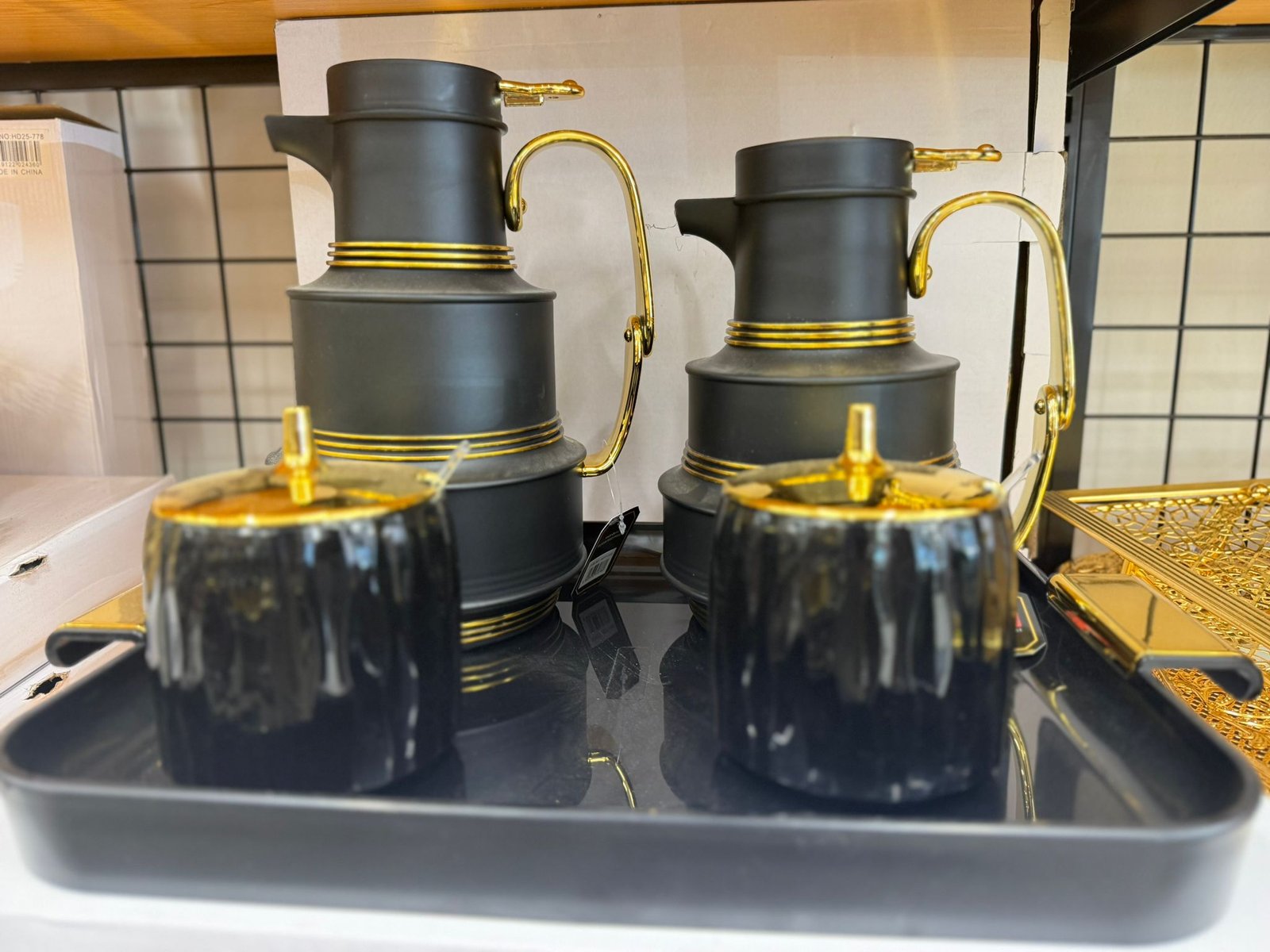 Set Termos e Zuccheriera Nero e Oro – Elegante Set da 6 Pezzi per Tè e Caffè con Vassoio