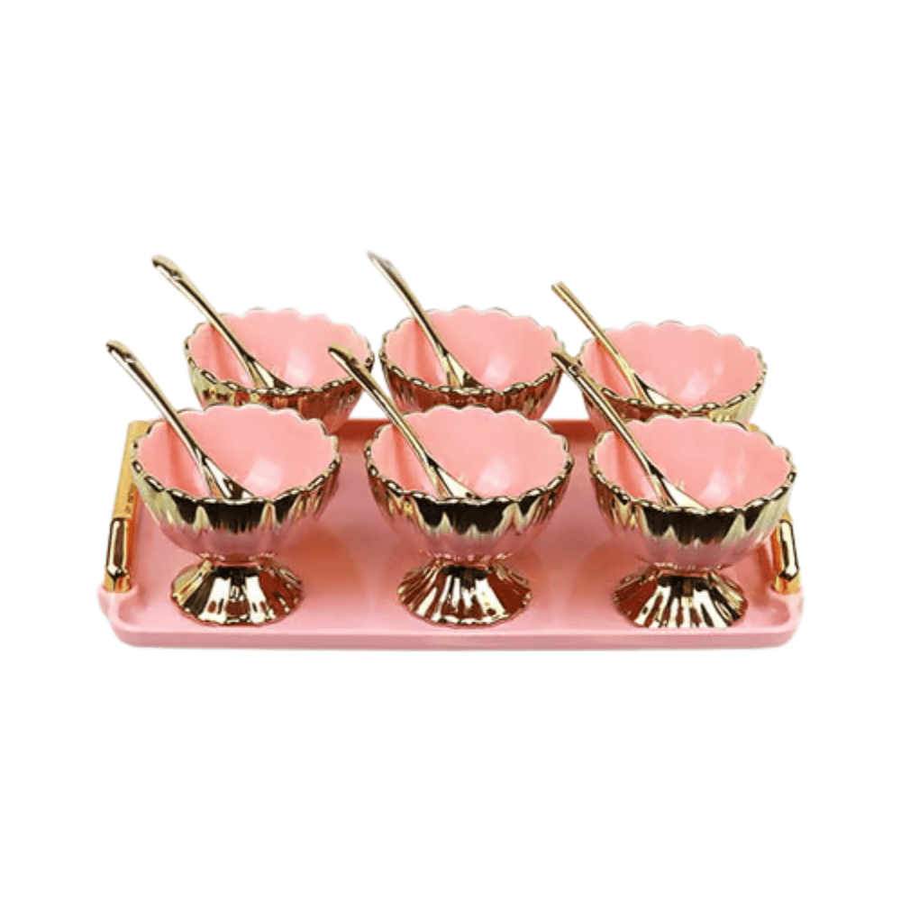 Eleganti Tazze da Dessert in Porcellana con Vassoio, perfette per servire dolci, creme o gelati con stile. Realizzate in porcellana di alta qualità, combinano design raffinato e praticità, rendendo ogni momento di dessert speciale e sofisticato.
