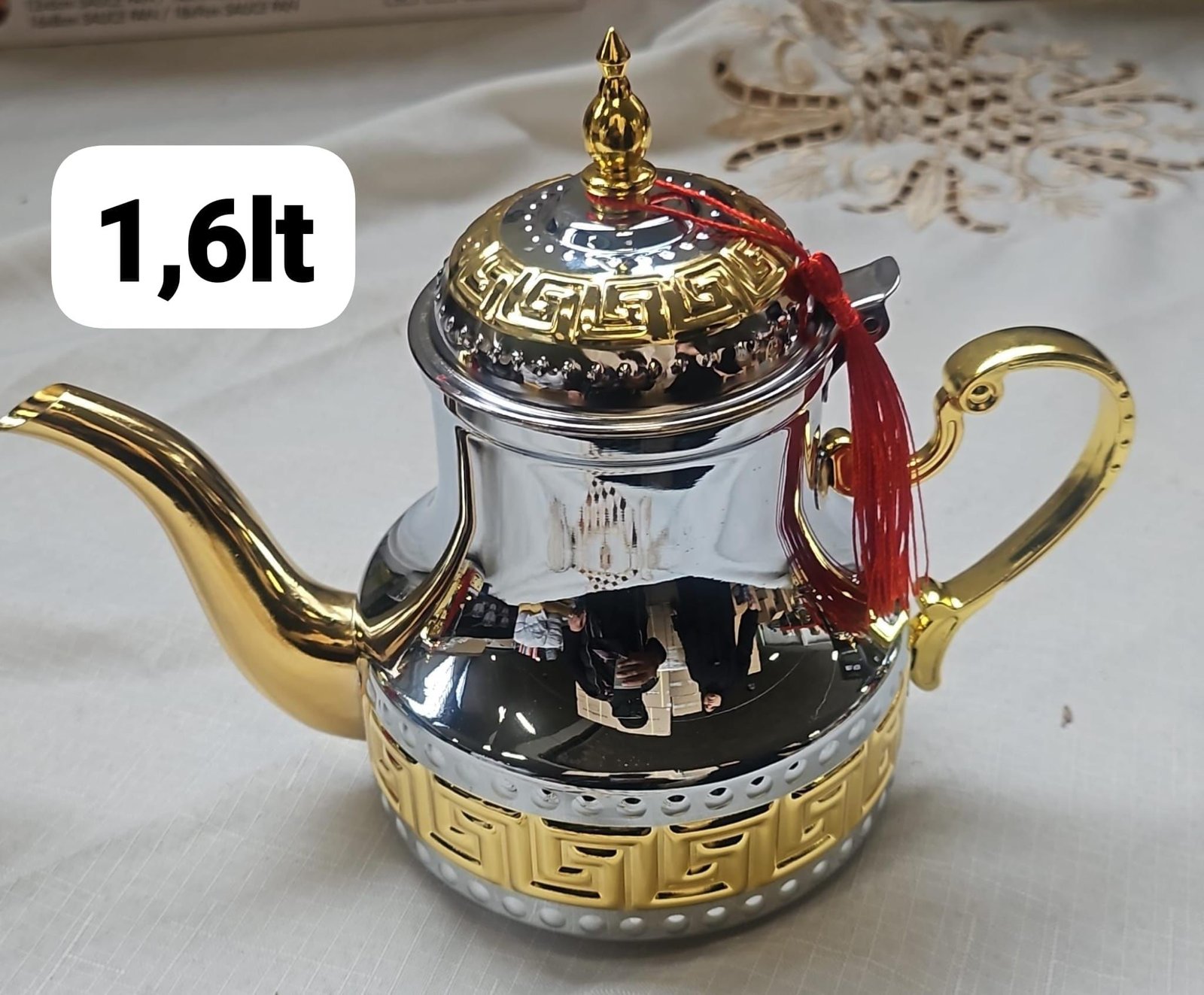 Luxurious 1.6L Moroccan teapot in gold and silver finish, perfect for serving tea in style.