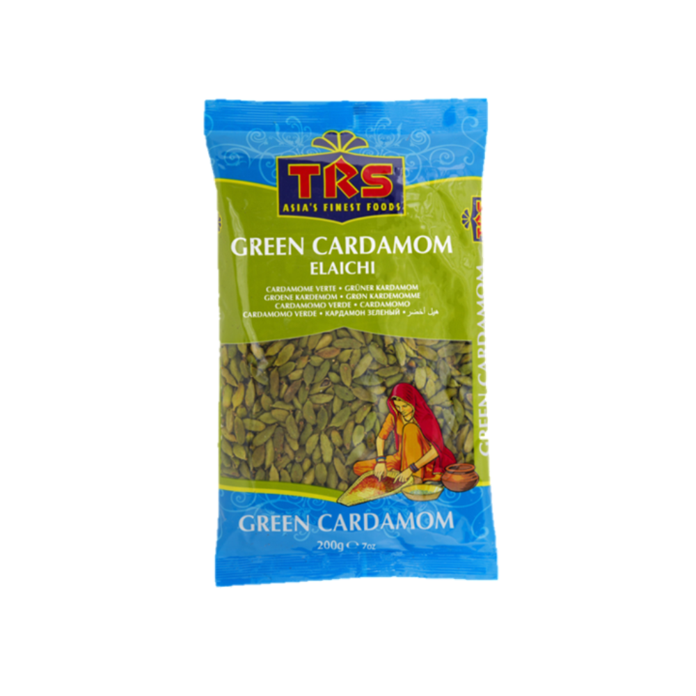 TRS Green Cardamom (Elaichi) are whole aromatic pods with a sweet, floral, and slightly spicy flavor, widely used in Indian and South Asian cooking, desserts, and beverages.