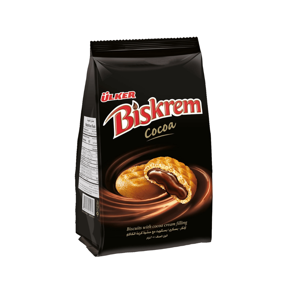 Ülker Biskrem Cocoa Filled Biscuits feature crisp golden cookies filled with smooth, rich cocoa cream. A perfect blend of crunch and indulgent chocolate flavor in every bite.