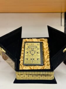 Elegante scatola nera in stile Kaaba con iscrizioni arabe dorate e dettaglio della Moschea della Mecca. Ideale come regalo o decorazione spirituale.